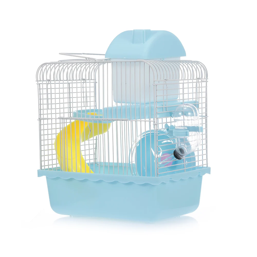 Two-Story hamster cage, including an exercise wheel, a slide, a water dispenser.